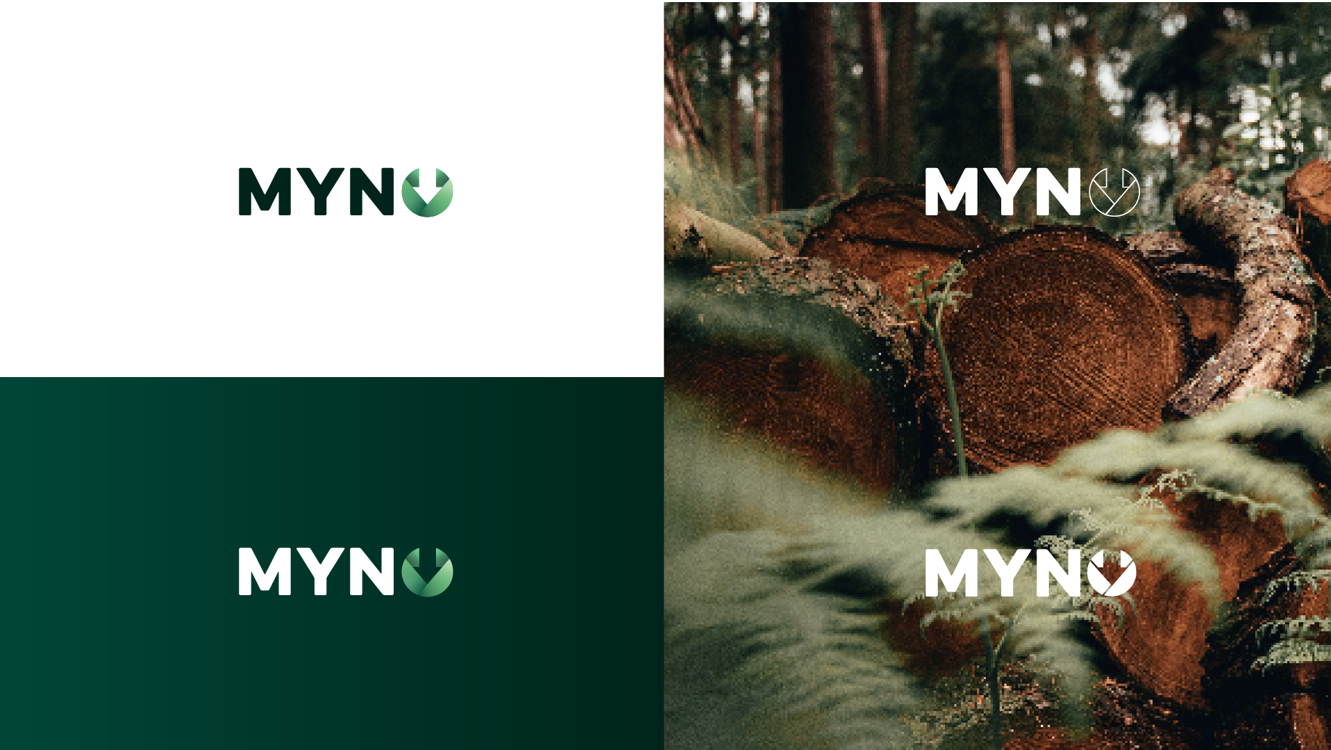 The logo is unique to Myno and their core purpose, formed by overlapping leaf elements to represent the Biochar industry, and forming a downward arrow to represent their mission to capture carbon from the atmosphere into the earth.